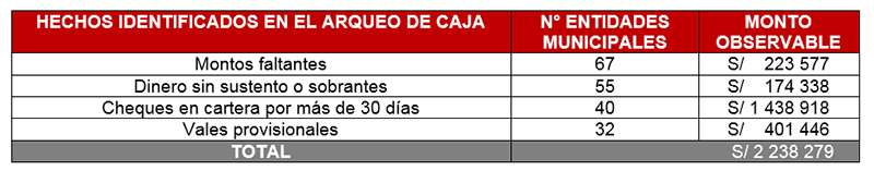 En 67 entidades municipales se identificaron montos faltantes por S/ 223,577, situación que se atribuye al uso del efectivo de funcionarios y trabajadores, así como al no haberse cumplido con depositar en las cuentas bancarias el íntegro de la recaudación directa de la municipalidad, en el plazo de 24 horas, establecido normativamente. Dicha situación observada en el 24.9% de entidades municipales visitadas, genera el riesgo de pérdida, sustracción, apropiación y/o uso indebido de los fondos municipales.