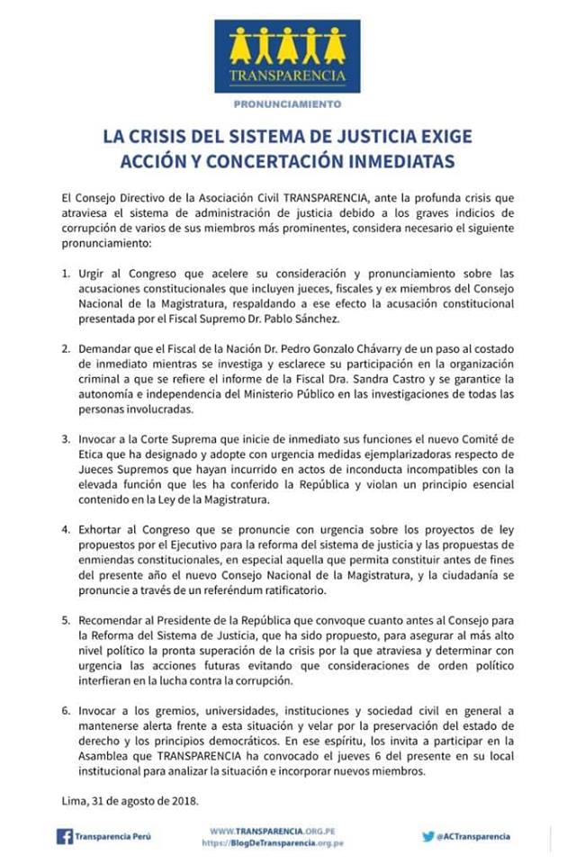 Este pedido se dio a conocer a través de un comunicado en el que Transparencia demanda también que se garantice la autonomía e independencia del Ministerio Público en las investigaciones de todas las personas involucradas en este caso.