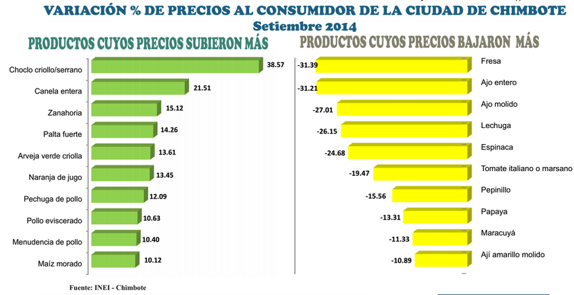 Chimbote en Línea.- El Instituto Nacional de Estadística e Informática (INEI), Oficina Zonal Chimbote, dio a conocer a través de una nota informativa, que la Variación Porcentual Mensual del Índice de Precios al Consumidor (IPC) de esta ciudad, correspondiente al mes de Setiembre fue de 0.32 %, teniendo una variación acumulada (Dic. 2013 a Set. 2014) de 2.72% y anualizada (Setiembre 2013 a Setiembre 2014) de 3.07 %.
