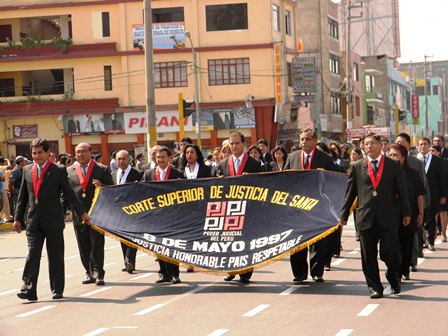 Los magistrados y trabajadores judiciales participaron del izamiento del Pabellón Nacional y del desfile dominical en la plaza de armas de Chimbote.