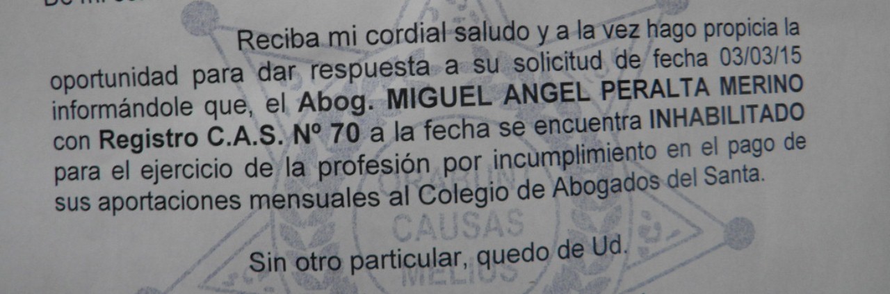 Peralta Merino, ligado al excandidato a la presidencia regional de Ancash, Arturo Torres Calderón, estaría impedido de ejercer su profesión, por deudas que datan desde noviembre del año pasado hasta el día de hoy.