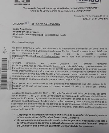 Chimbote en Línea.- Tras la información propalada a através del diario digital Chimbote en Línea y gracias a las imágenes de nuestros miles de lectores , sobre el estado en que se encuentra el puente peatonal del Terminal Terrestre, cuyas estructuras han sido dañadas por la corrosion y corren inminente riesgo de desprenderse, la comsionada de la Defensoría del Pueblo en Chimbote, Roslin Villanueva, envió al alcalde de la provincia del Santa, Roberto Biceño, un oficio solicitando un informe pormenorizado de esta estructura pública.