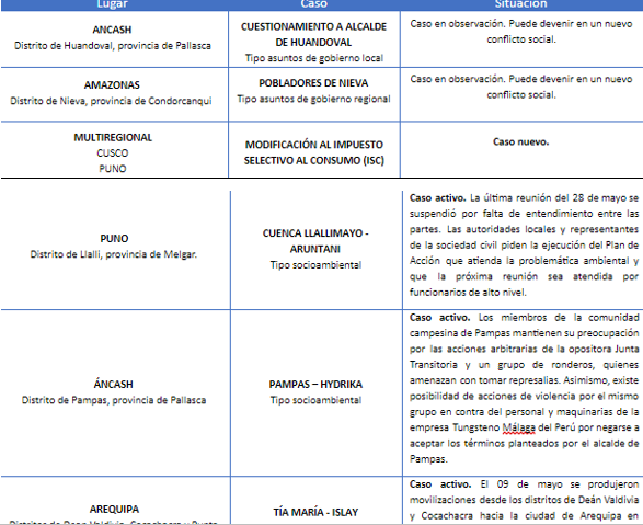 Chimbote en Línea.- Durante el mes de mayo, la Defensoría del Pueblo registró cuatro nuevos conflictos sociales, ubicados principalmente en las regiones de Áncash, Huánuco, Piura y uno de carácter multiregional (Cusco, Puno, Tacna, Apurímac, Madre de Dios, Arequipa), según lo señala el Reporte de Conflictos Sociales N°171 presentado hoy.