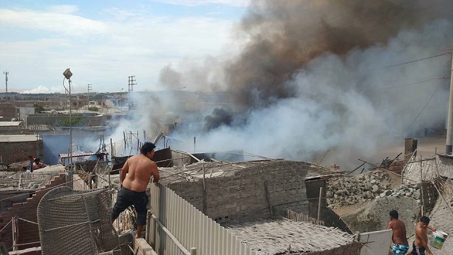 Chimbote en Línea. – Un incendio de proporciones se registró esta tarde en el asentamiento humano Santa Rosa de Nuevo Chimbote. El fuego dejó en escombros cinco modestas viviendas.
