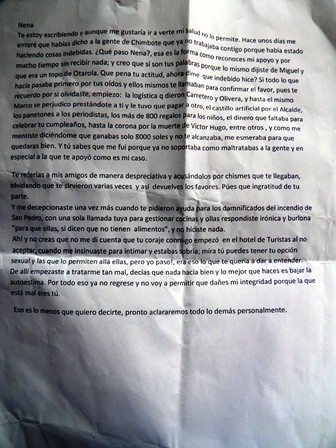 Galarza Vidal confesó que envío el mensaje electrónico a Nena Escalante para aclararle que siempre trabajó para ayudarla en su gestión y no para cometer cosas indebidas. Aceptó también que sufría acoso sexual por parte de su exjefa y que por no ceder a sus pretensiones empezó a ser maltratada.