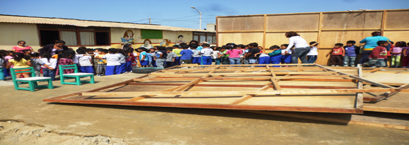 Los 180 niños del nivel inicial de la Institución Educativa N° 1685 ubicado en el asentamiento humano Villa Magisterial paralizaron hoy sus labores en protesta porque la Junta Vecinal ha desarmado algunas de sus aulas para reubicar el jardín y priorizar la construcción de un campo deportivo en la zona. (Texto y foto Cintia Cabrera)