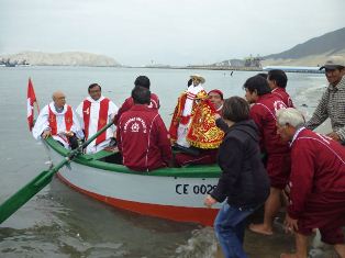 Nuestro patrono fue colocado en la embarcación llamada Hillary II, en donde sus tripulantes recibieron a la venerada imagen con mucho amor y donde la alegría contagió e hizo baliar a los presentes. Luego se hizo el trasbordo del Santo patrón a la embracación principal Rivar IV, donde esperaban las principlaes autoridades locales y regionales, capitanes y comandantes portuarios; asimismo de la