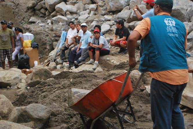 Adra Perú ha actuado en apoyo a los damnificados en catástrofes naturales como el terremoto de Pisco el año 2007 llevando carpas, alimentos, víveres y ropa a los miles de damnificados, en el 2012 estuvo en apoyo de los damnificados de los huaycos que asolaron el distrito limeño de Chosica, el 2013 llevaron abrigo a miles de familias de los departamentos de Cusco y Puno que fueron asoladas por las bajas temperaturas.