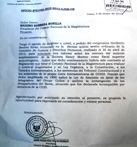 La presidenta de dicha comisión, María Soledad Pérez Tello de Rodríguez, envió el oficio N° 01446 al titular del Consejo Nacional de la Magistratura, Máximo Herrera Bonilla, pidiendo que informe sobre el nombramiento de Nancy Moreno a solicitud de Heriberto Benítez.