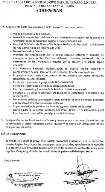 En la carta que fue entregada en la misma sede regional en Huaraz la sociedad civil organizada le pide que el mandatario junto a su equipo exponga su plan de gestión regional, y a la vez reciba los aportes del Codescsar que permitan la reactivación económica de Áncash.