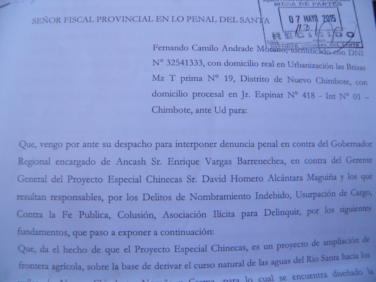 La denuncia que también alcanza al gerente del proyecto especial Chinecas, David Alcántara Maguiña fue interpuesta por el ciudadano Fernando Camilo Andrade Moreno quien cuestionó dicha designación a pesar que el Reglamento de Organizaciones y Funciones (ROF) establece que la gerencia del proyecto irrigador debe estar a cargo de un ingeniero especialista en Hidráulica y no de un médico cardiólogo.