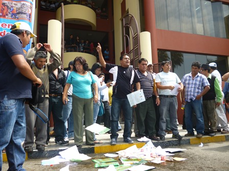 Un grupo de revoltosos pescadores hicieron un plantón en el frontis de la comuna provincial, arrojando documentos informativos que Perupetro les habría proporcionado a inicios de la reunión. (Texto y fotos Milton Palpa)