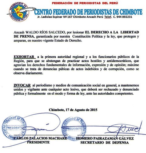 Asimismo en el documento exhortan a la primera autoridad regional y a los funcionarios públicos de la región, para que se abstengan de practicar actos hostiles y antidemocráticos, que agravian los derechos fundamentales de informacióm, expresión y de opinión; máxime cuando se trata de denuncias públicas de actos indebidos y de corrupción, como se observa diariamente.