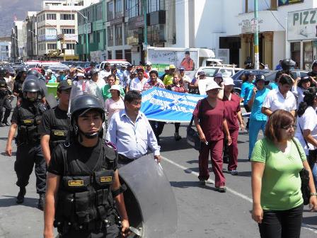 Portando banderolas y algunos carteles los servidores públicos se volcaron a las calles de Chimbote para denunciar que la aplicación