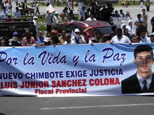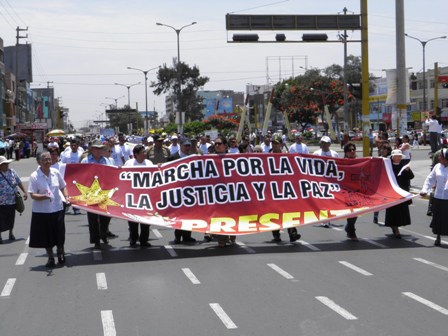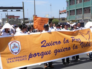 Unas dos mil personas, de todas las edades, de las diferentes parroquias de Chimbote, sociedad civil, colegios profesionales, estudiantes universitarios y algunas autoridades locales, se unieron en una sola voz en la “Marcha por la Vida, la Paz y la Justicia”, convocada por la Diócesis de Chimbote y el Colegio de Abogados del Santa, para decir BASTA YA a la violencia que impera en nuestra ciudad y no a la cultura de Muerte y la Impunidad.
