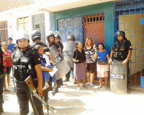Chimbote en Línea (Locales).- Al promediar las 10 de la mañana, más de una docena de policías acompañados de la juez, Kelly Romero Suyón del Cuarto Juzgado de Paz Letrado Especializado del Poder Judicial, se apersonaron hasta la manzana Z lote 2 del pueblo joven Villa España, para desalojar a la humilde madre de familia, Norma Cárdenas Armas quien fue estafa por su amiga y teniente gobernadora del referido pueblo, Ana Charum Juárez.