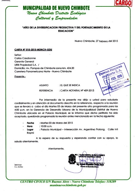 Chimbote en Línea.- Luego de enviar hasta tres cartas notariales solicitando dialogar sobre los terrenos invadidos, el gerente general de la empresa URBI Propiedades, Carlos Cassabone, finalmente aceptó reunirse con el alcalde de Nuevo Chimbote, Valentín Fernández Bazán.