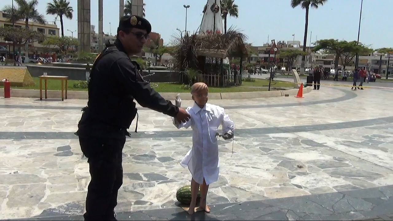 Los agentes de la Unidad de Desactivación de Explosivos del Escuadrón de Emergencias hicieron detonar en la Plaza de Armas de Chimbote algunos de estos productos en un maniquí y una sandía.