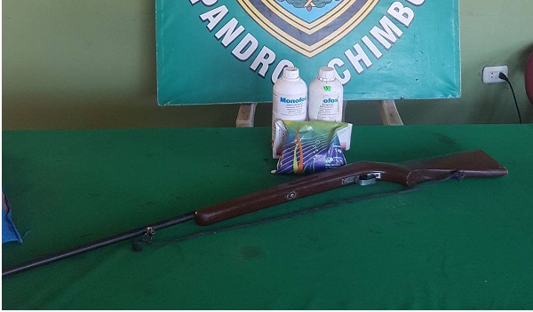 También se informó que a un costado de dicho terreno hallaron dos frascos de insecticida agrícola y una bolsa de fertilizante; además se halló una escopeta hechiza.