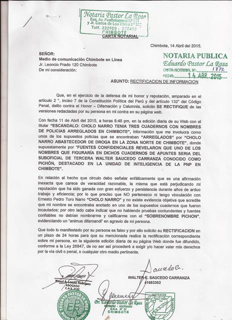 Se trata del suboficial de Tercera Walter Saucedo Carranza, destacado en la Unidad de Inteligencia de la PNP en Chimbote, quien a través de una carta notarial negó estar involucrado con el sujeto que hace algunos algunos días fue capturado por agentes del Grupo Terna.