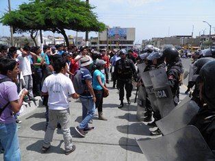 Chimbotenlinea.com (Por: Lindberg Cruzado).- Efectivos policiales dispersaron con gas lacrimógeno a unos 300 estudiantes de la Universidad Nacional del Santa (UNS) que marchaban pacíficamente por el centro de Chimbote exigiendo la derogatoria del artículo 7 de la Ley 29914, el cual contempla que el pago a los docentes contratados se realicen con los recursos de las propias casas universitarias.