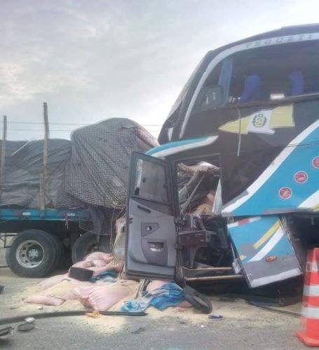 Así lo informó esta mañana la Policía Nacional que precisó que el accidente se produjo entre un ómnibus interprovincial de la empresa Erick El Rojo, de placa C4H-965; una auto particular marca Chevrolet de matrícula BFP- 504; un tráiler de placa V2E-758 y un vehículo policial que tiene la matrícula EPE-050.