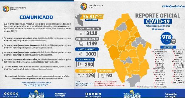 Chimbote en Línea. – Cinco personas fallecieron con coronavirus en Áncash, aumentando las víctimas mortales a 92, en una región donde se han reportado hasta hoy 978 casos confirmados, entre pruebas moleculares y rápidas.