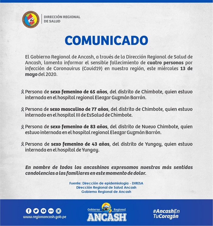 Los fallecidos son tres mujeres de 65, 83 y 43 años de Chimbote, Nuevo Chimbote y Yungay, respectivamente. Asimismo, murió un varón de 77 de Chimbote en el Hospital III de EsSalud de Chimbote.